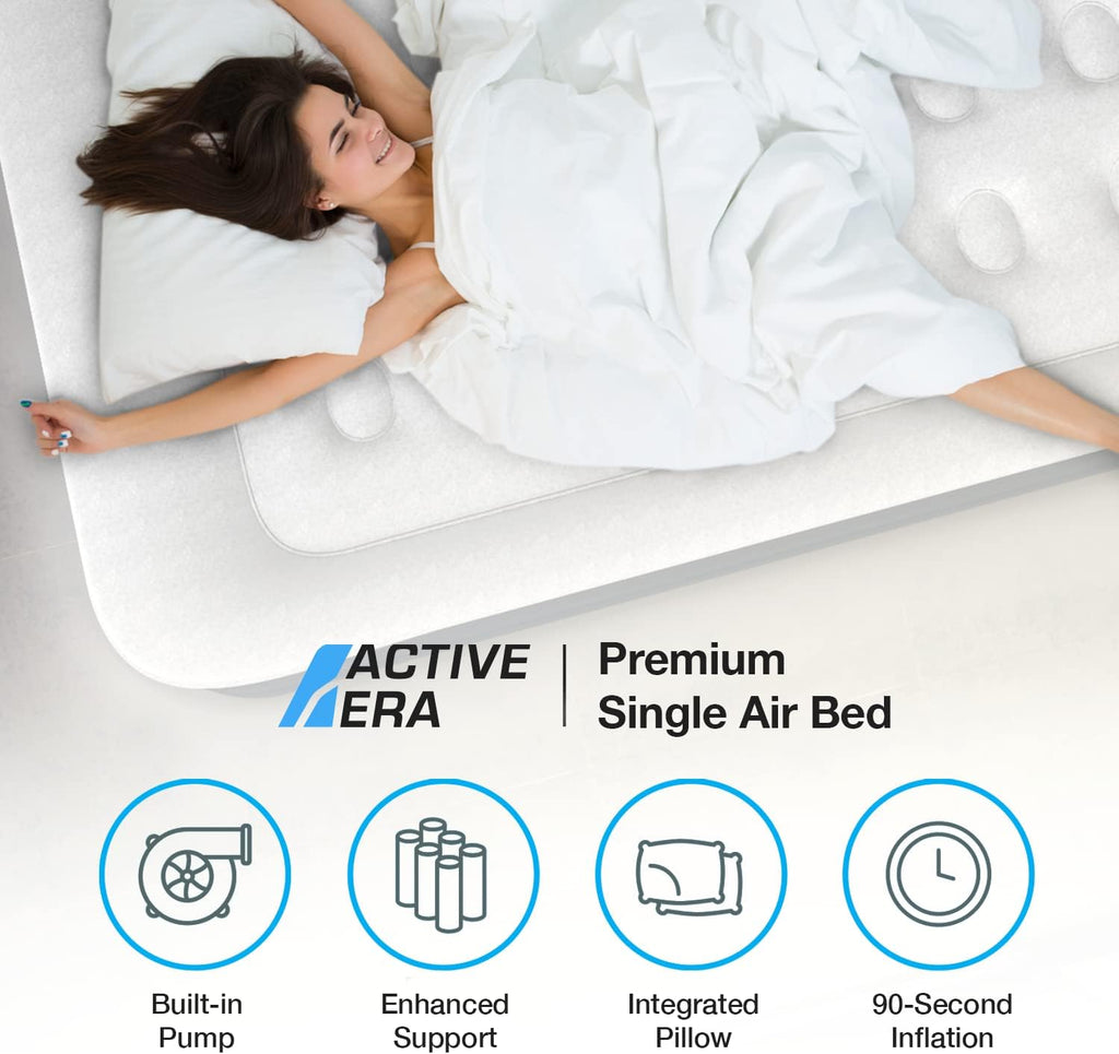 - FAST INFLATION: The integrated easy-to-use electric pump quickly inflates the twin size inflatable bed to full firmness in less than 3 minutes. At the flick of a switch, it will automatically deflate the airbed for easy storage and transportation in the handy travel bag provided.