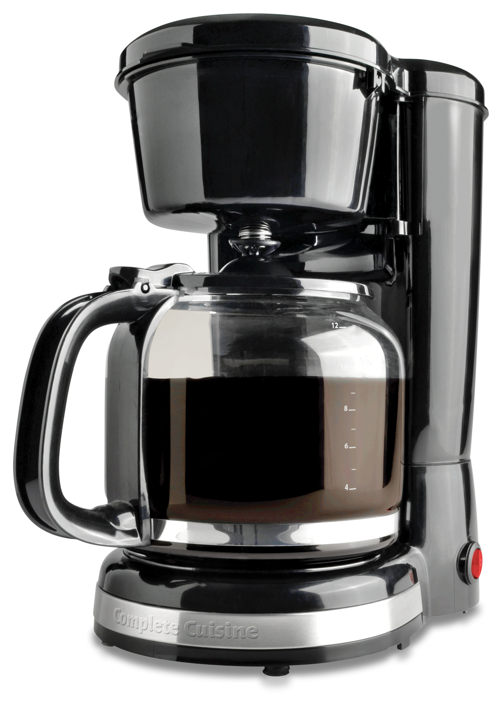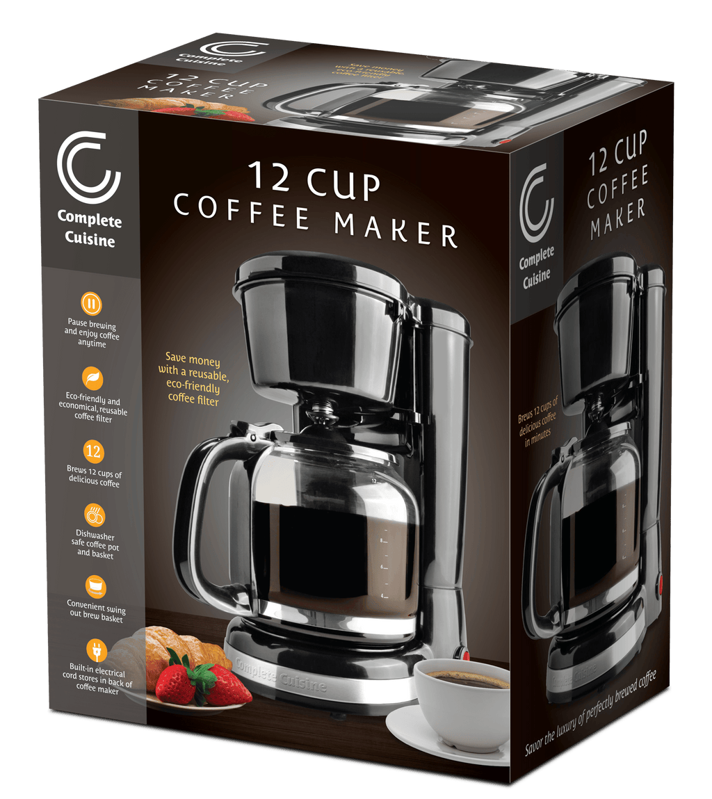 Complete Cuisine 12 cup Coffee Maker - a sleek and stylish addition to your kitchen. Say goodbye to messy overflows with the Water Window, which provides clear visibility as you fill the reservoir. The easy cord storage feature eliminates countertop clutter, keeping your kitchen neat and organized. Crafted with high-temperature-resistant glass, the coffee jar ensures durability and safety. The warming plate keeps your brewed coffee delightfully warm until you're ready to serve, ensuring every cup is as enjoyable as the first sip. This coffee maker is designed to be lightweight and portable, making it a versatile addition to any kitchen.