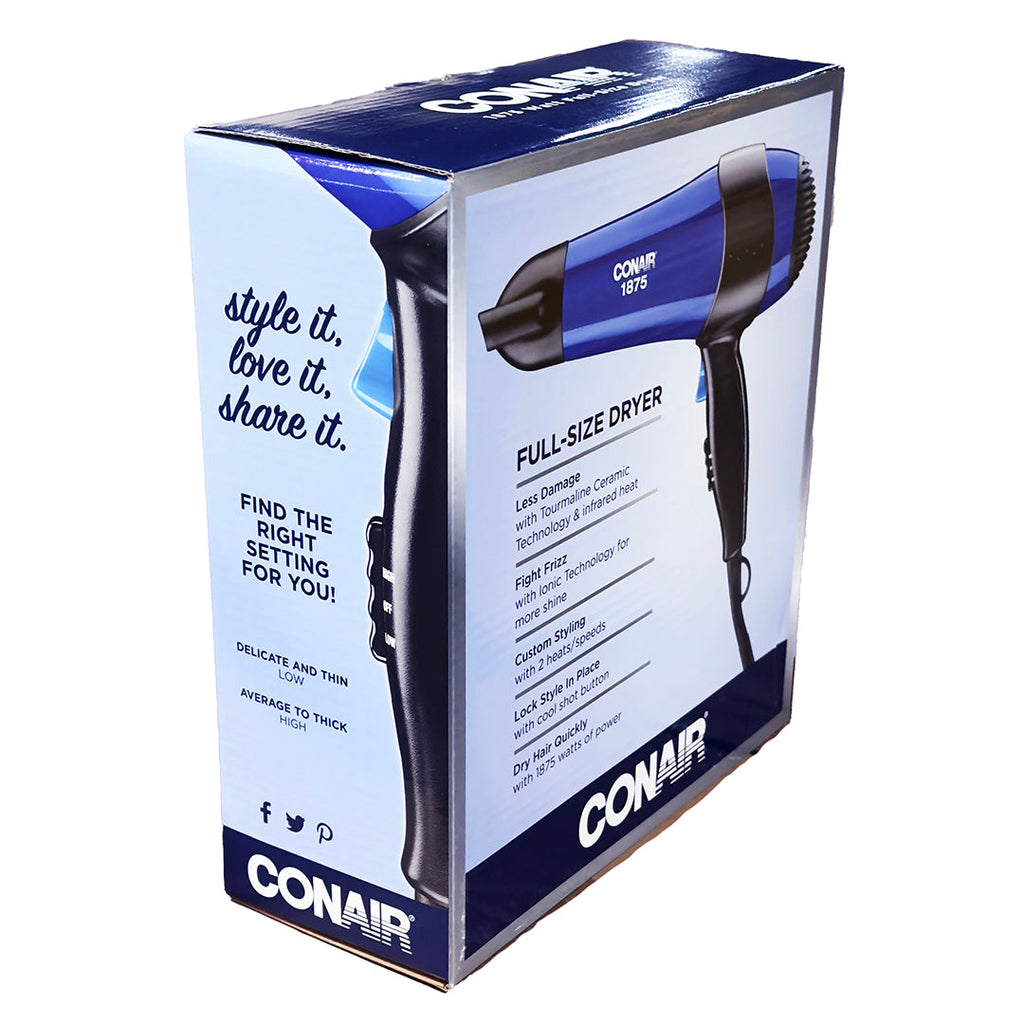 Pick up an INFINITIPRO BY CONAIR advanced ceramic Hair dryer to protect hair from heat damage while drying and styling. The self-regulating heater in this blow dryer reduces hot spots, and dual heat technology makes hair drying fast and gentle. Ionic technology adds shine and reduces frizz, and the attachments provide styling versatility. The concentrator attachment for this dryer allows for pinpoint styling and the diffuser attachment enhanced curls and waves. This hair dryer also has 3 heat/2 speed settings, A removable filter, a true cold shot button and delivers a powerful performance with an 1875 Watt AC motor.