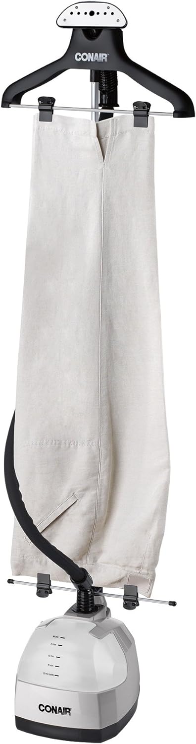 The Conair Ultimate Fabric Steamer gives you 1500 watts of steaming power. It will give you 90 minutes of constant steam and only takes 35 to 45 seconds to heat up. It has convenient clips for steaming pants and a rotating hanger for various other garments. And cleaning is a breeze with the easy empty release valve. It has a t-nozzle for optimum steaming and features a fabric hose.