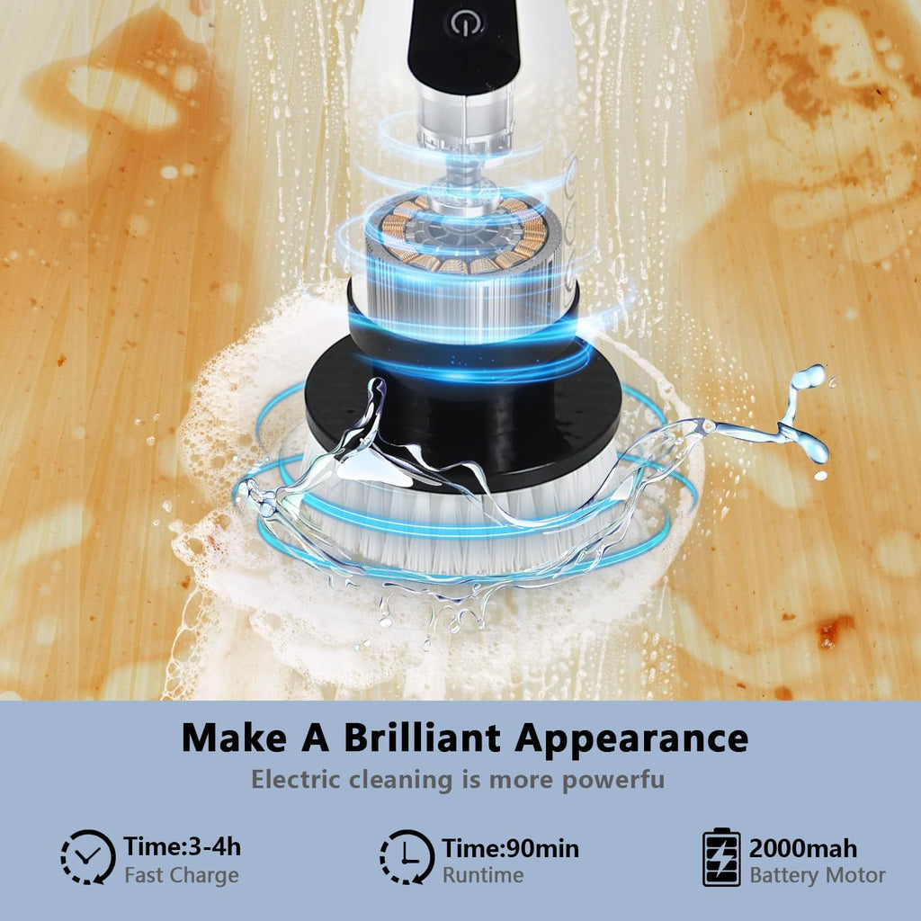 - 90 Mins Runtime:The shower cleaning brush has a 2000mah battery body, which only takes 3-4 hours of fast time. After charging, it can be used for about 90 minutes. The cordless electric bathroom scrubber allows you to easily clean any corner of the room, with low noise and a volume of less than 80dB