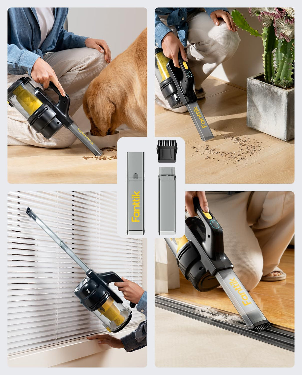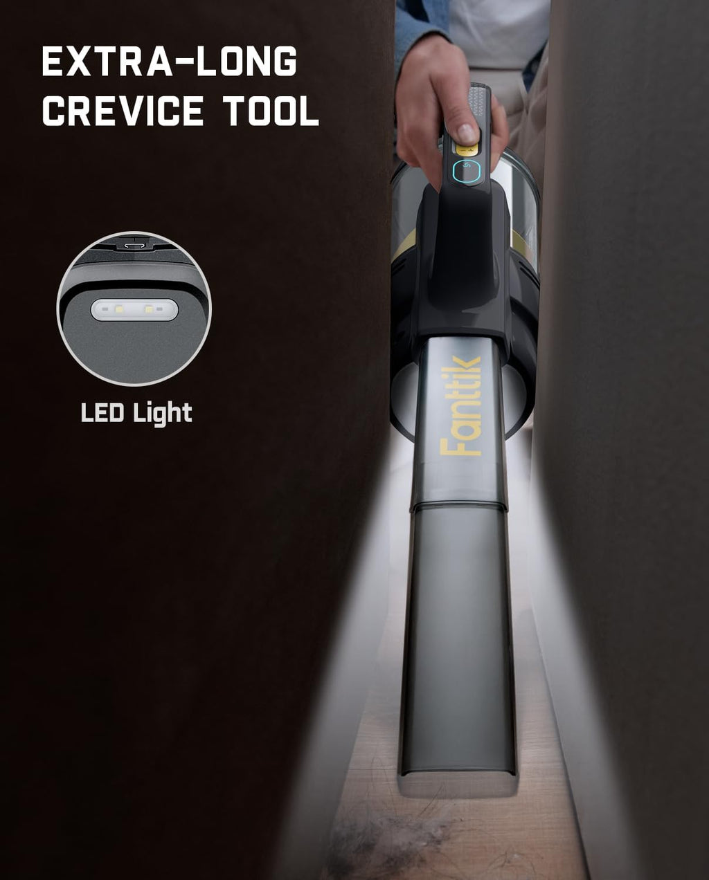 - Extra Long Crevice Tool & Bright LED Light: Fanttik V9 Handheld Cordless Vacuum can easily clean dirt and debris in high traffic areas around the house and works great on your car interior, too. Our crevice tool combined with extension tube is perfect for cleaning all the nooks and crannies with less effort. The Built-in LED light is easy to switch at night or in the shadows under seats
