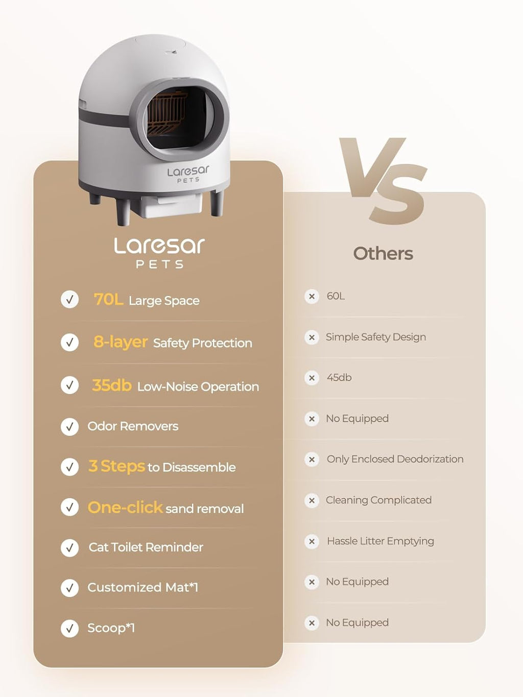 - The Laresar Pets Litter Box automatically cleans itself, saving time and effort for pet owners while ensuring a consistently clean environment for multiple cats.