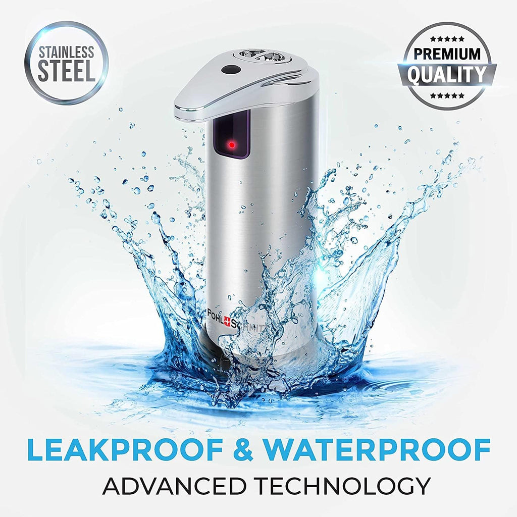 - Fingerprint and Stain Resistant Made from durable, water-resistant materials with a clean brushed stainless-steel design. No need to plug in or install, the kitchen soap dispenser is powered by 4 x AAA batteries (not included) and leakproof and waterproof advanced technology prevents water penetrating the sensors or batteries.