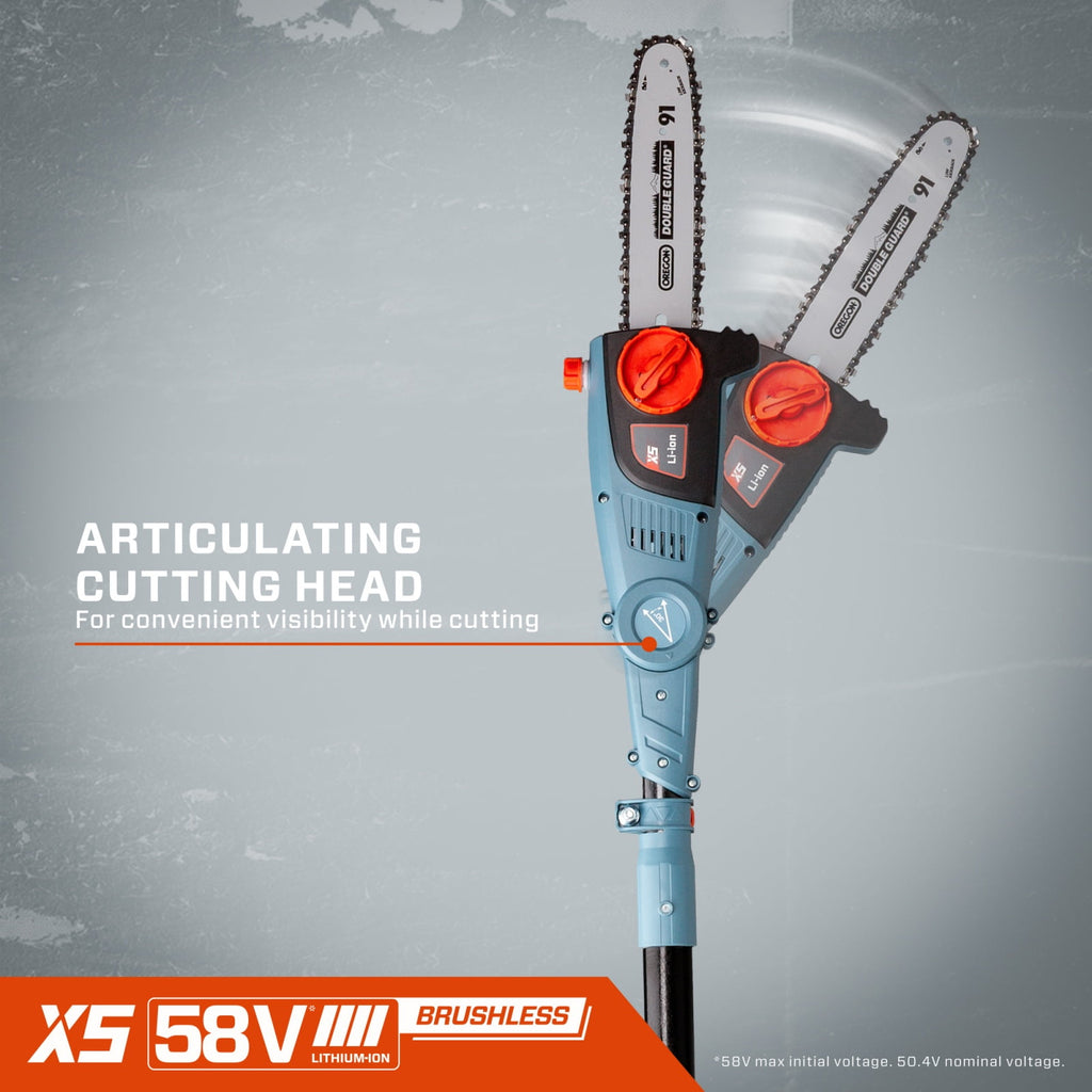 The SENIX CSPX5-M-0 58 volt cordless pole saw features a 10 in. Oregon bar and chain equipped with a 3/8 in. pitch chain for aggressive and smooth cutting and a tool-less chain tensioning system to easily keep the chain properly adjusted. The auto oiler provides continuous lubrication to the bar and chain to ensure high performance and trouble-free cutting. The adjustable pole provides extended reach of up to 14 ft. high. For use with SENIX B25X5 2.5 Ah battery and SENIX CHX5 2 amp charger. Includes bar cover.