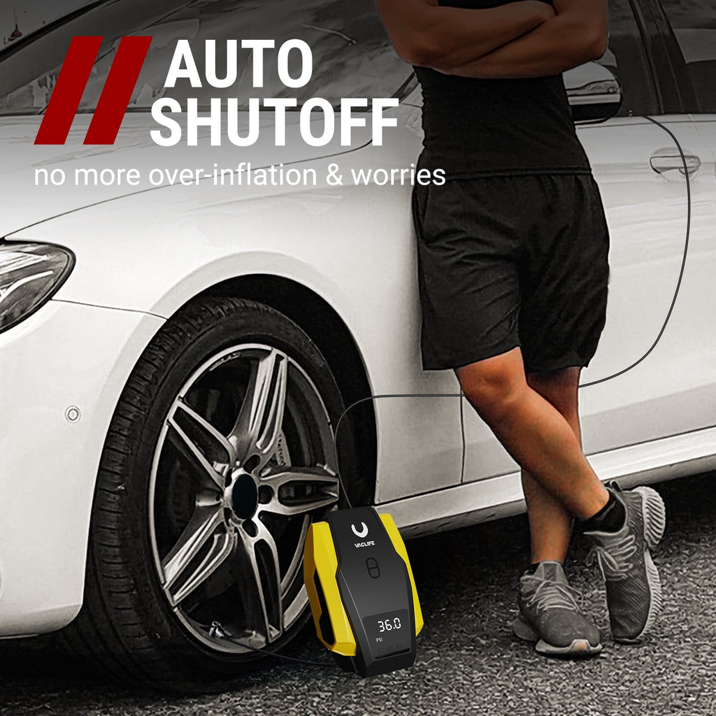 - [AUTO SHUT OFF] Simplicity meets functionality. VacLife car air pump provides you with rest-assured using experience based on the auto-shut off function. Preset the desired pressure level and start inflating job. The car air compressor will shut off automatically at the desired level. There is no need to worry about over inflating, VacLife smart inflator for tires got your back.