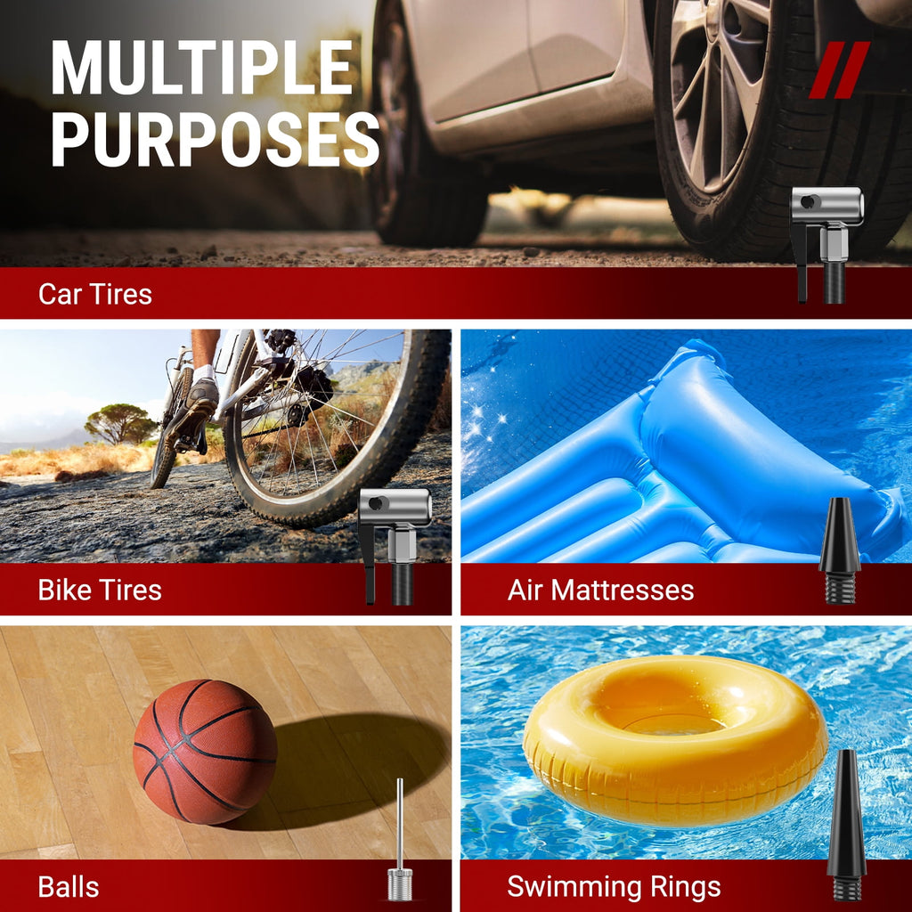 - [MULTIPURPOSE NOZZLES] VacLife tire pump is equipped with 3 additional nozzles besides the original. A wider applying range to cover various needs for inflatables such as vehicle tires and sports or entertainment equipment including compact or midsize Sedan, SUV, ATV, bike, motorcycles, air mattress, inflatable boats, balls.