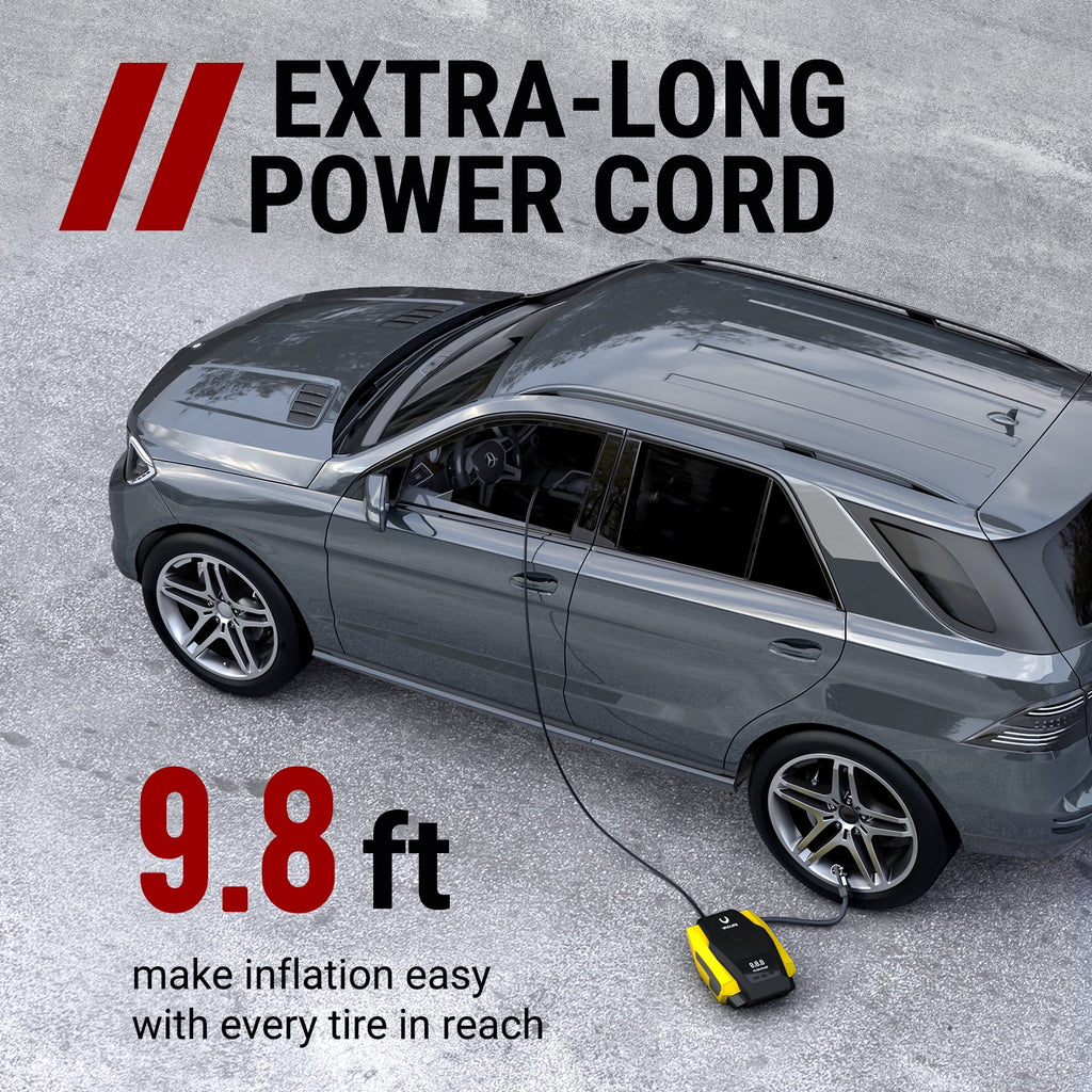 - [LED LIGHTING FOR NIGHT TIME] To be a proper solution for night time inflating job, the electric air pump comes with a LED-lighting feature to support your inflating needs in low-light environment. Coupled with the 9.8ft power cord, both of the front and the rear tires will be fully taken care of with less efforts as it eliminates the unnecessary hassles of unplugging the appliance every time you switch from a tire to the other.