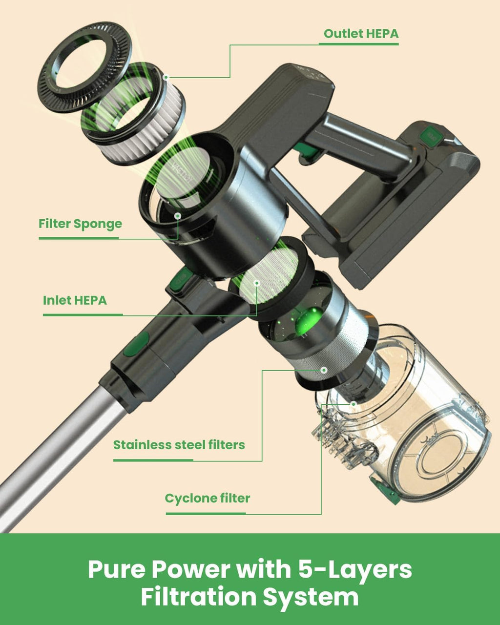 - High-efficiency Filtration SystemWith its 5-layers high-efficiency filtration system, the V9 cordless vacuum cleaner effectively removes up to 99.97% of microscopic dust particles as small as 0.3 microns. Equipped with a sealed cyclone filtration system, it ensures an optimal living environment by eliminating secondary air pollution. Additionally, the Hepa filter is reusable after cleaning.