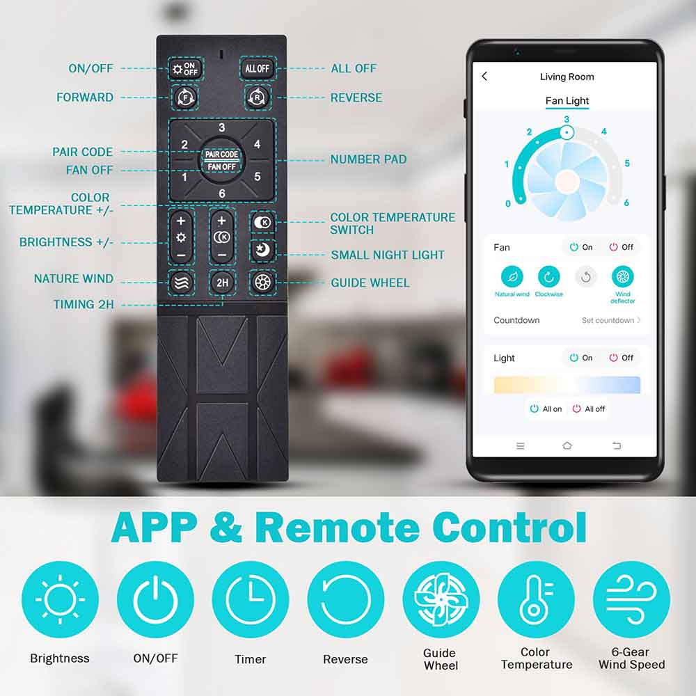 - Combines function of LED light & fan & provides convenient control via Bluetooth APP or remote controller
