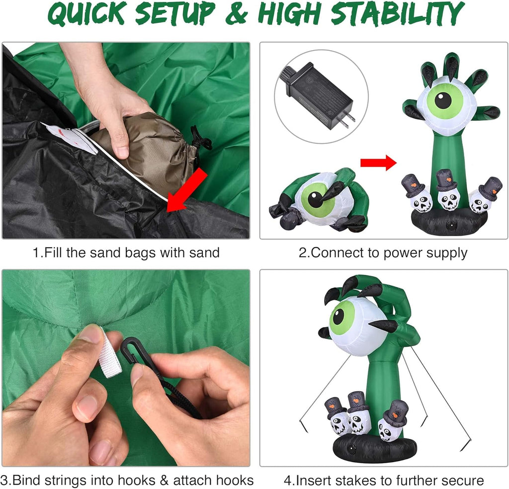 - [Motion-Activated]: 6ft Halloween Inflatable Monster Hand with eyeball and 3 skulls features a motion-sensing function, which causes it to light up and make loud terrifying sounds when it senses someone approaching within 16 ft, creating an atmosphere full of horror for Halloween